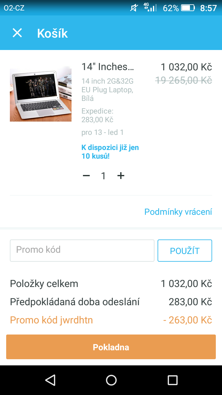pokial "ukončíš "platenie,vyhodí Ti to,že už je "sold out" a za tú deklarovanú minimálnu cenu tam kúpiš výlučne len 7" tablet.....u tých väčších automaticky rastie cena,takisto musíš zobrať do úvahy,že predajcovia sú aj užívatelia wishu,takže za minimálnu cenu môžeš kludne kúpiť repasovaný/opravovaný/použitý stroj bez akejkolvek dalšej záruky a pokial bude funkčný,nemáš v podstate ani nárok využiť obmedzenú 30dňovú lehotu na vrátenie tovaru a peňazí,ktorá sa dá využiť len v prípade nefunčného,vadného alebo strateného tovaru počas zasielania....