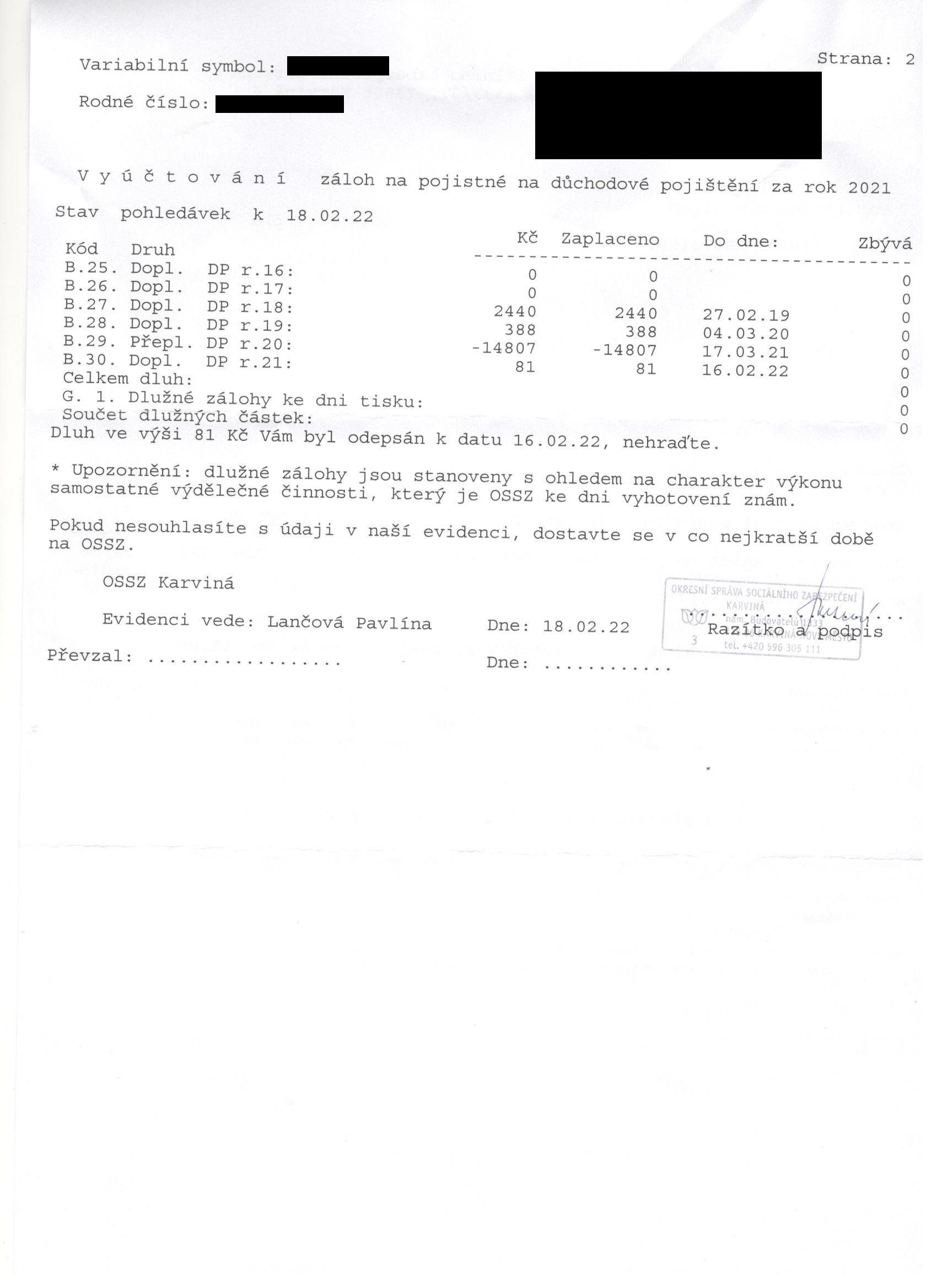 Tak malé částky (myslím do stovky?) OSSZ odpouští. Prostě jako bys to zaplatil, tím je rok uzavřen.…