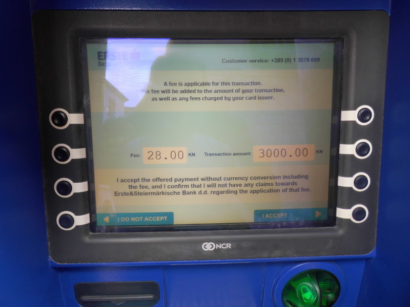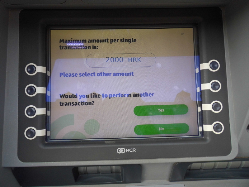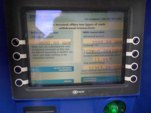 V Chorvatsku to automaticky bude v EUR nebo CZK (DCC - Direct Currency Conversion) a se zlodějským poplatkem (20-50 kun (cca 70-175 Kč) navrch). DCC se dá odmítnout, ten dodatečný poplatek ne (respektive jeho odmítnutí znamená storno transakce a nutnost hledat jiný bankomat). Vyzkoušel jsem přes 10 bankomatů (jen bankovních, euronet a další nebankovní sítě jsem rovnou vynechával) než jsem uspěl s požadavkem na výběr bez zlodějského dodatečného poplatku. Uspěl jsem u bankomatů banky OTP a zdálo se, že má hustou síť bankomatů (limit na transakci byl 2000 kun, což neni zase tolik (ekvivalent cca 7000), ale bylo to bez poplatku a kuny si přepočítala moje banka (fio) podle svého kurzu). Tento bankomat jsem vyzkoušel spíš náhodou, když jsem chtěl zkusit erśte (říkal jsem si, je to slušná banka), ale jako u nás byla u něj fronta. Erśte jsem pak vyzkoušel také a taky nabízel srovnatelně nevýhodné podmínky (kunu za 4.20 když byla 3.50 nebo zúčtování v kunách a poplatek 33 kun).
