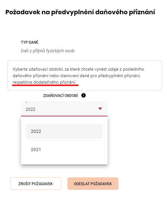 To je pozadavek na predvyplneni. Protoze ted podavas za 2023, tak si ho muzes nechat predvyplnit z minuleho, coz je 2022 nebo 2021.